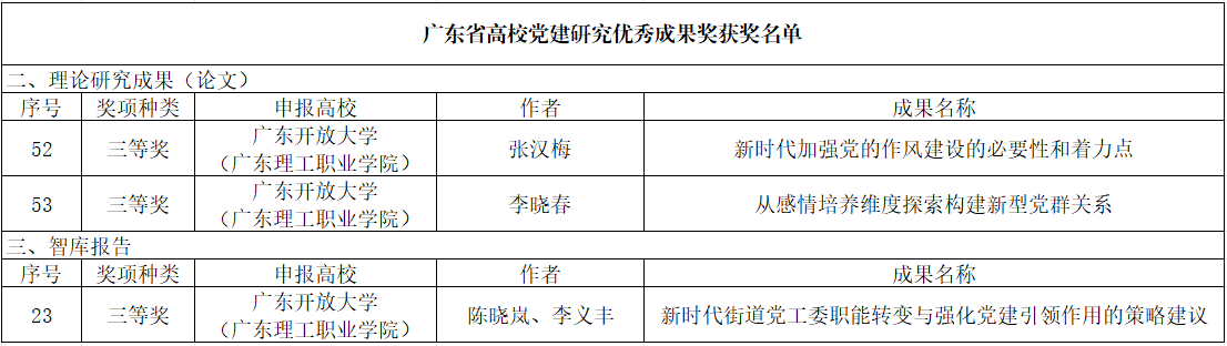 近日,广东省高等学校党的建设研究会公布高校党建研究优秀成果奖获奖名单,学校共有3项党建研究成果获评。获奖成果聚焦新时代党的建设重大理论和实践问题,既有对党的作风建设、党群关系构建的深入理论探讨,也有对基层党建引领治理创新的务实对策研究,体现了学校党建研究服务大局、扎根实践的鲜明导向。